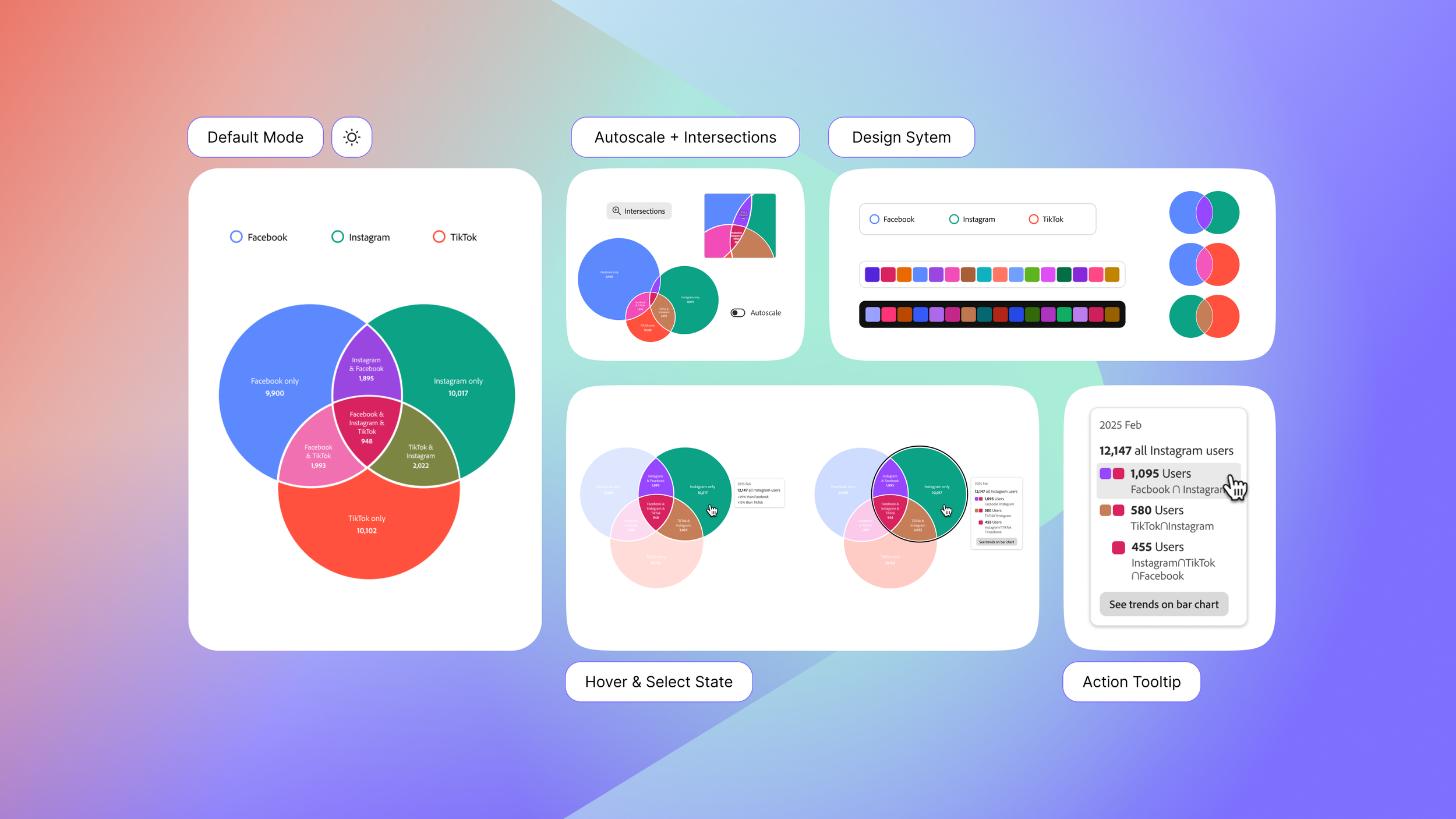 Venn diagrams are especially valuable since they make overlaps, distinctions, and relationships between datasets immediately visible. Without this functionality, teams were forced to rely on third-party tools or static visuals, limiting both accessibility and storytelling potential. This gap reduced the effectiveness of React Spectrum Charts as a comprehensive toolkit for data-driven decision-making.